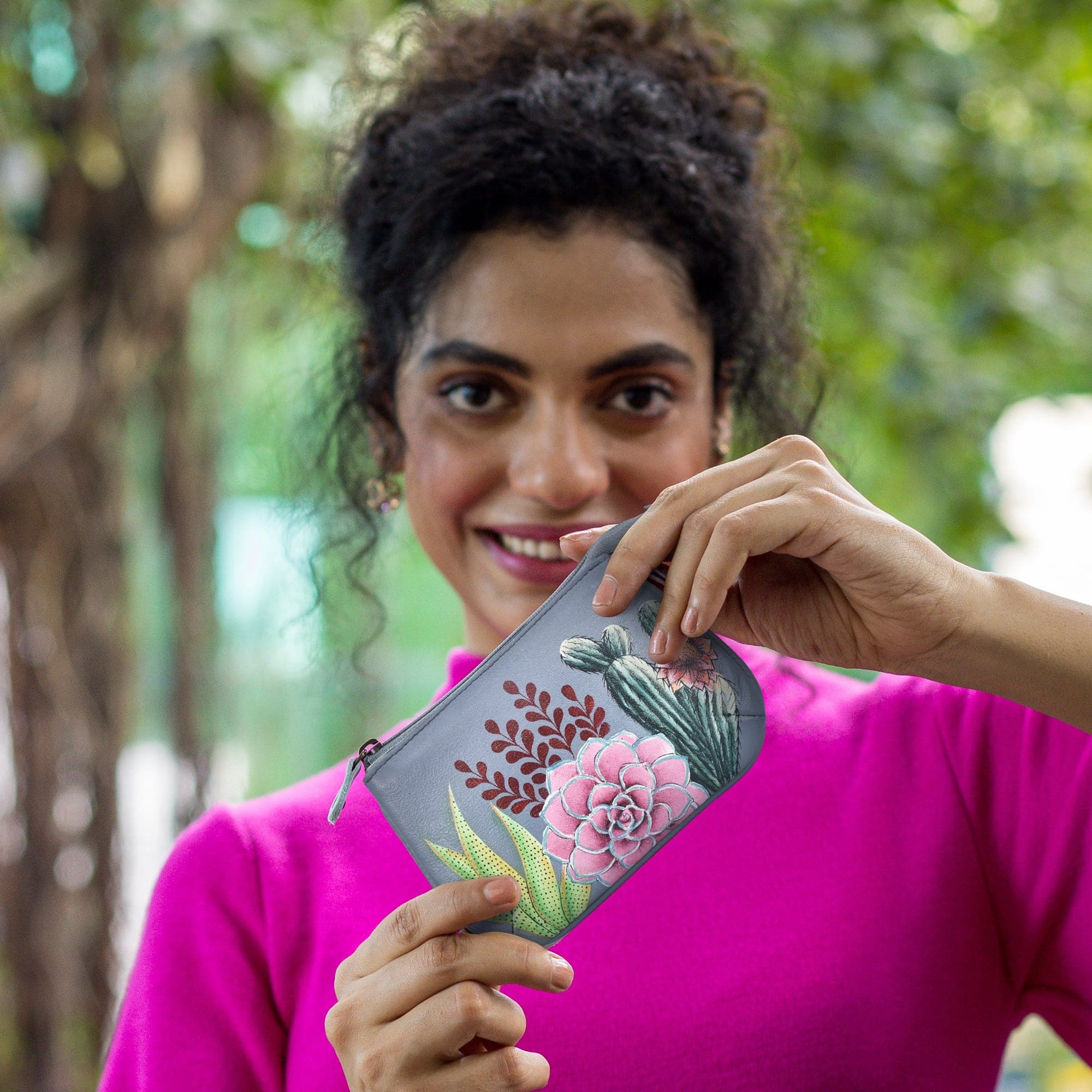 Medium Zip Pouch - 1107 - floral Hand painted original artwork. Genuine leather
